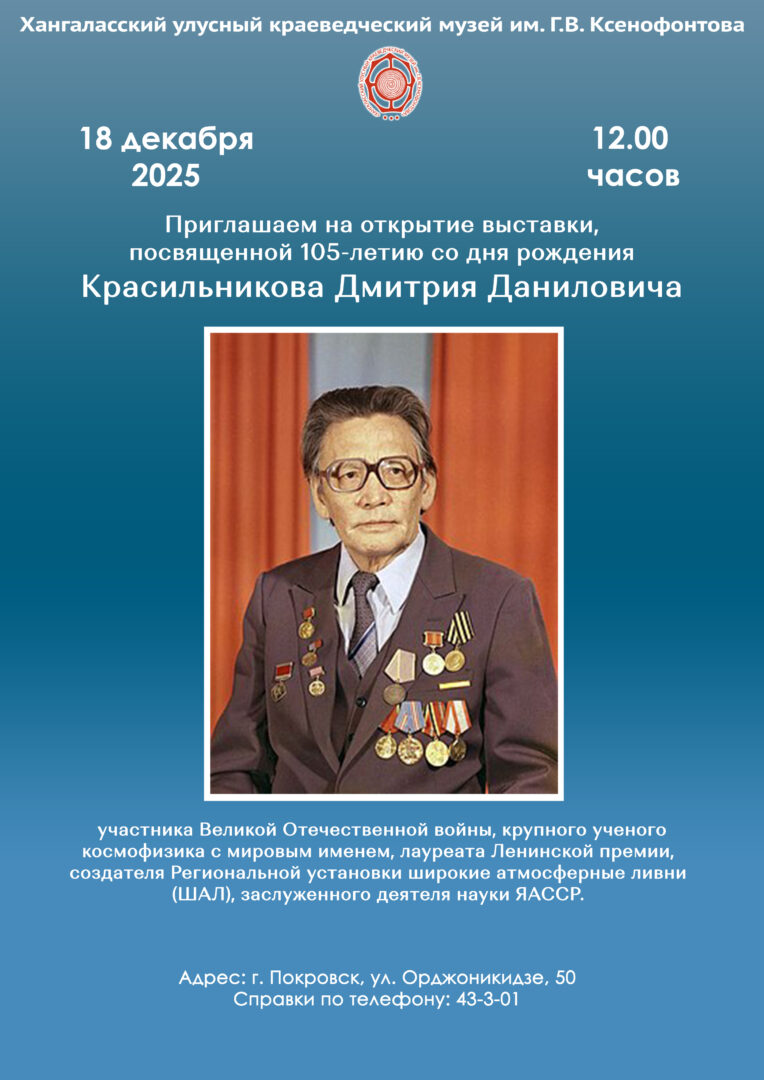 посвященную 105-летию со дня рождения Д. Д. Красильникова выдающегося якутского ученого-космофизика, фронтовика, основателя Уникальной Научной Установки (УНУ) «Якутская комплексная установка широких атмосферных ливней», лауреата Ленинской премии СССР