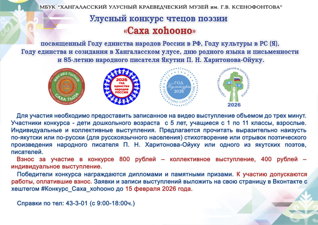 Хангаласский улусный краеведческий музей им. Г. В. Ксенофонтова проводит улусный конкурс чтецов поэзии «Саха хоһооно», посвященного Году единства народов России в РФ, Году культуры в РС (Я), Году единства и созидания в Хангаласском улусе, дню родного языка и письменности и 85-летию народного писателя Якутии П. Н. Харитонова-Ойуку. Приглашаем принять активное участие!